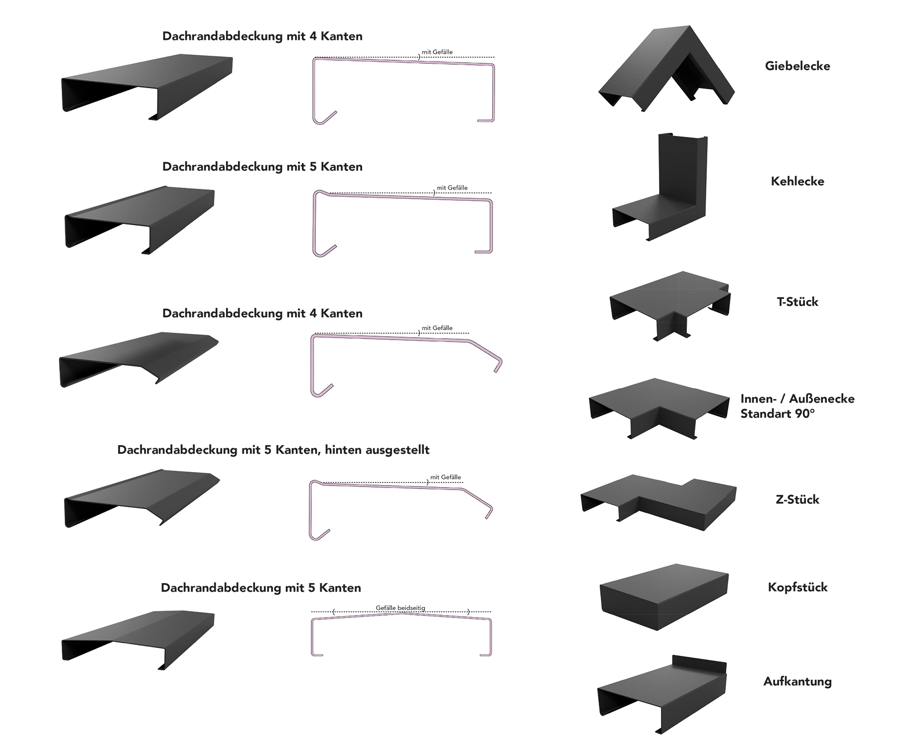Wir fertigen Mauerabdeckungen in verschiedenen Materialien mit Halteprofil und Gummidichtung nach Aufmaß. Gerne fertigen wir auch horizontal und vertikal gerundete Formteile mit verschiedenen Formen und Abschlüssen. Die herstellbare Länge beträgt bis zu 4000mm, der größtmögliche Tafelzuschnitt beträgt 2000mm. Verwendbare Materialien sind z.B. Zink und Kupfer (auf Wunsch auch vorbewittert) mit einer Stärke von 0,7 bis 1mm oder Aluminium (auf Wunsch auch Pulverbeschichtet) mit einer Stärke von 1,5 bis 3mm.